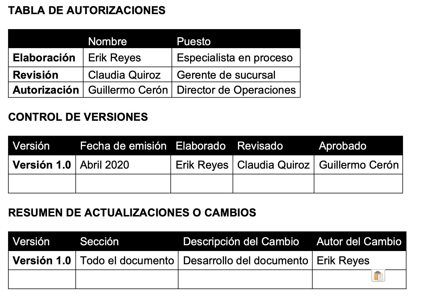 Se debe de asignar solo a una persona que actualice el manual de operaciones, es persona suele llamarse “Encargado de Aseguramiento de Procesos y Procedimientos” y será la responsable de evaluar si esas modificaciones son aptas al procedimiento, a los entregables o a las políticas de este. Todo el personal de la empresa o negocios, podrá sugerir cambios, pero no podrá modificar el manual, ya que esa ultima decisión dependerá de los directores de cada área o bien del director general o dueño de negocio.